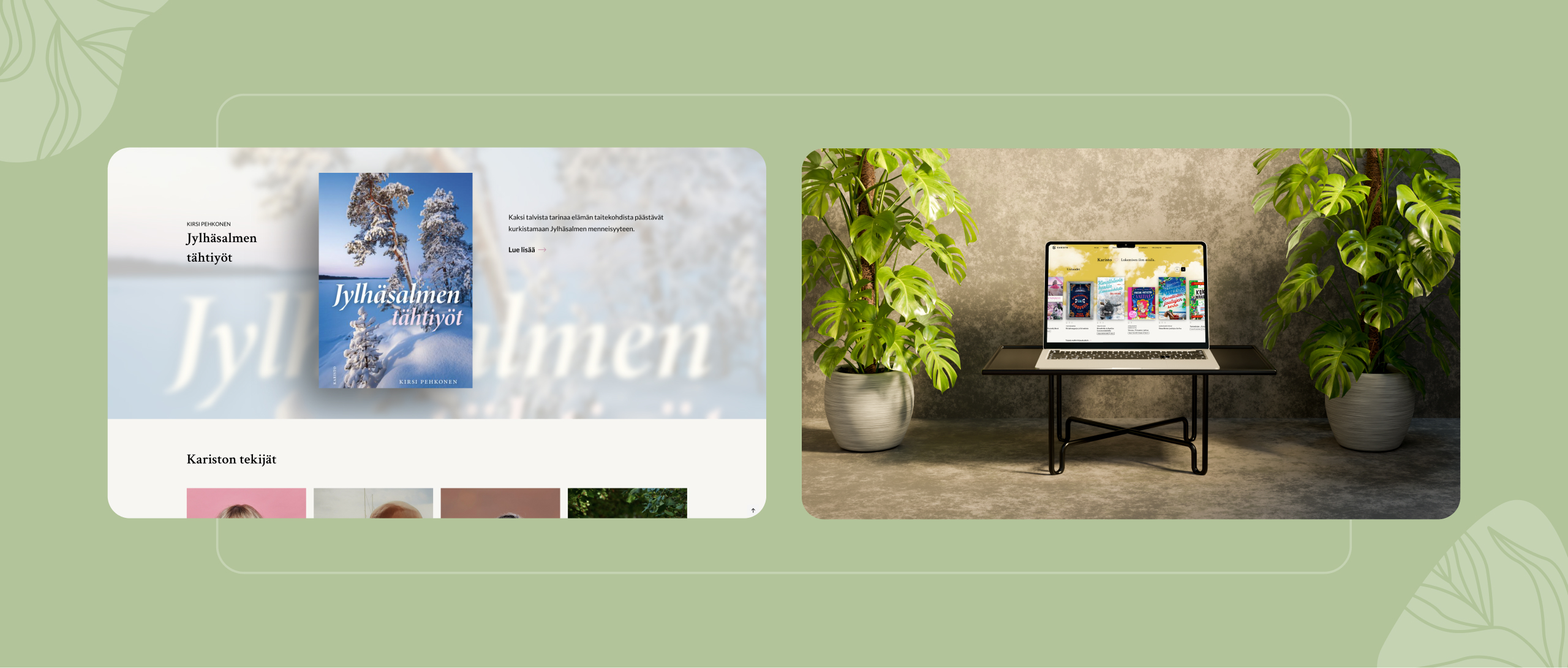 Kariston sivusto suunniteltiin heijastamaan kustantamon uniikkia ja värikästä brändiä raikkaalla tavalla. Visuaalinen kokonaisuus yhdistää Karistolle ominaisen monipuolisen kirjallisuuden ja persoonallisen värimaailman moderniin toteutukseen.